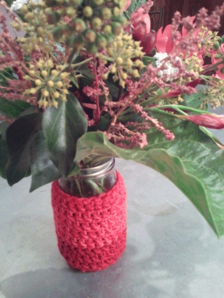 Et je suis passée (une fois de plus) pour une cinglée quand j’ai crocheté un "truc" pour transformer le pot de confiture vide en vase
