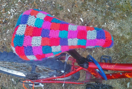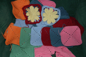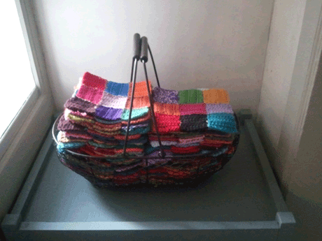 A sa grande surprise, Clo, après une période pas très crochet, a pratiquement terminé sa couverture! Il ne lui reste plus qu’à faire une bordure, probablement à point serré, mais elle ne sait pas encore de quelle couleur.
