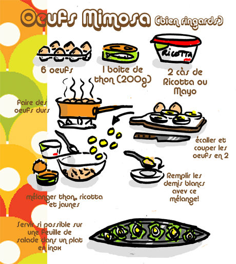 Alors avant de me prendre une troisième claque, je prends les devants et je le clame bien fort: en plus des pains perdus et des salades de fruit, je fais aussi des oeufs mimosa et même, j’en mange! Parce que ça a beau être totalement has been, mes enfants, dont l’aîné à 11 ans, ne sont pas du tout au courant. Pour eux quand je fais des oeufs mimosa, je suis la meilleure maman du monde, la plus cool, un monument de génialitude! Alors c’est pas la peine de venir m’expliquer que c’est nul, n’en déplaise aux fashionistas des fourneaux, je continuerais à en faire et même que si je veux je les sers dans des plats en plastique orange tupperware, na!