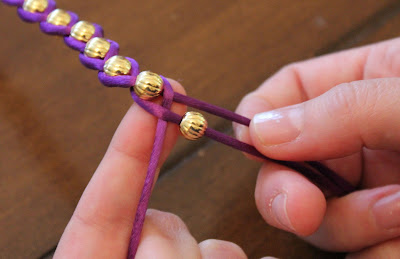 Sur les rubans les plus larges on accrochera les clous, et on pourra coudre la chaîne de strass (à l’aiguille à broder)