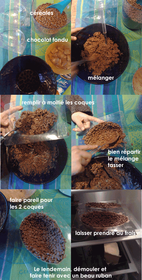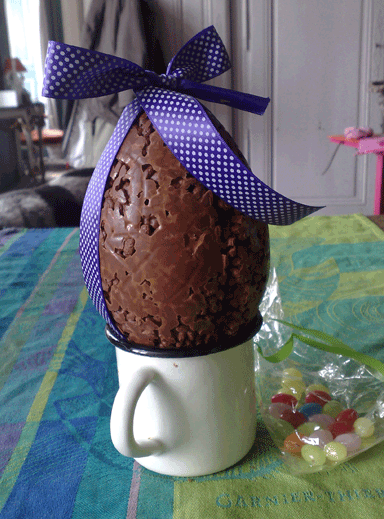 pour un gros oeuf, 200g de chocolat et autant de « rice crispies » que le chocolat fondu peut absorber. Celui là c’est Achille (8ans) qui l’a fait.