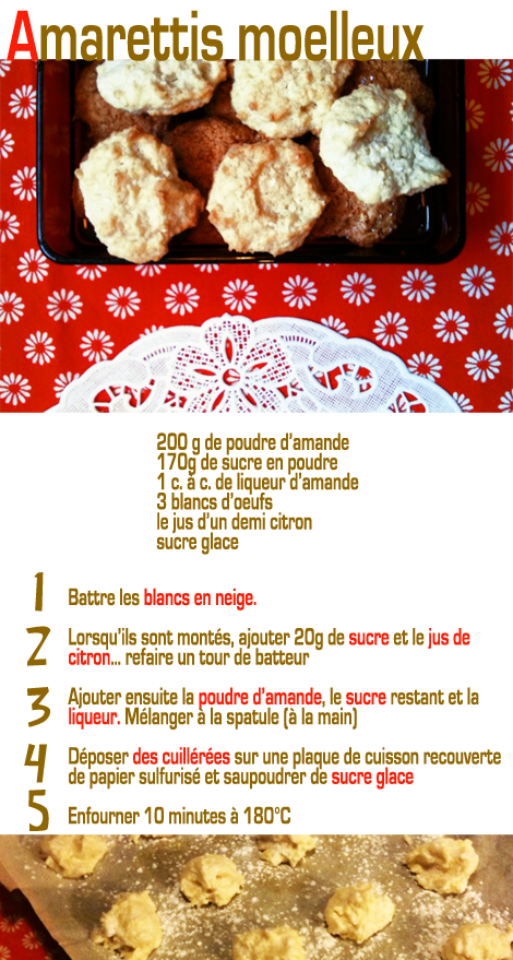 Vous aimerez peut-être aussi :Mon grand voulait une douceur pour son exposé sur la gastronomie italienne. Le Tiramisu n’étant pas facile à transporter dans le cartable, nous avons choisi les amarettis, plus réaliste… mais des moelleux, hein, pas des croquants, pour que les examinateurs ne se cassent pas les dents!