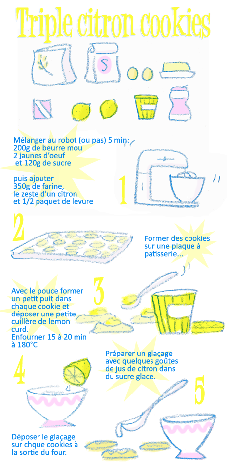 Cookies nés d’une trèèèès grande envie de citron… comme j’ai longtemps attendu avant de les préparer, j’ai carrèment mis la dose!