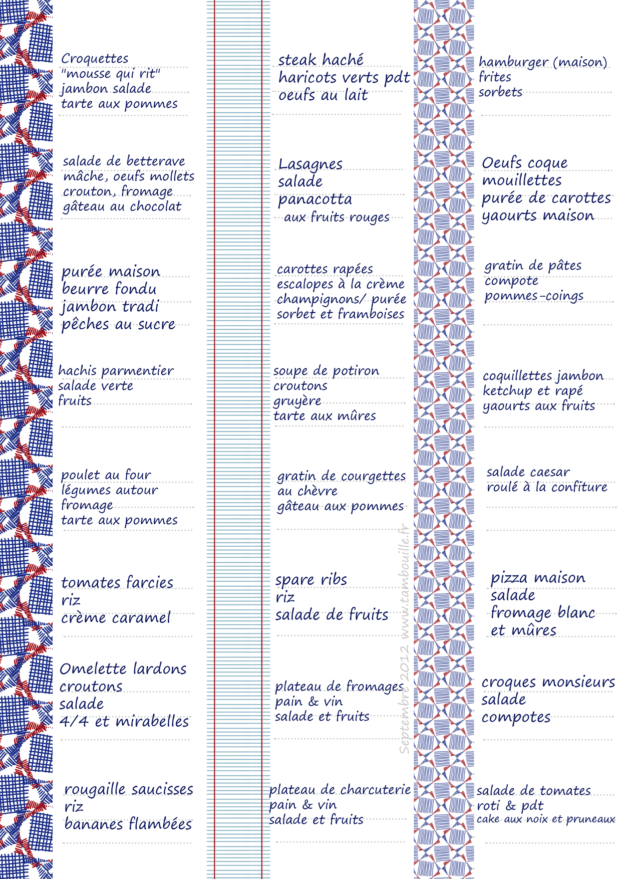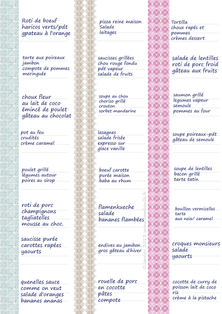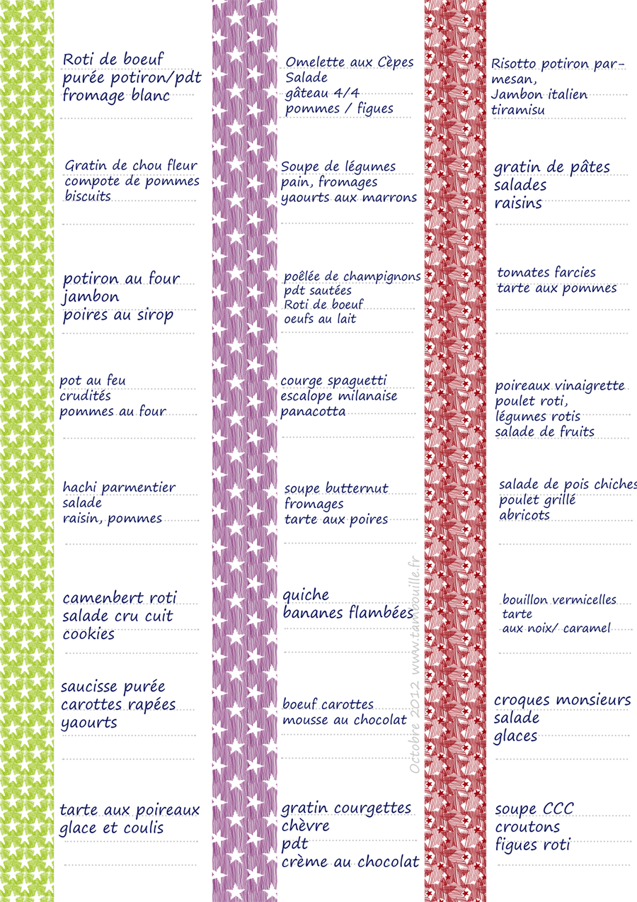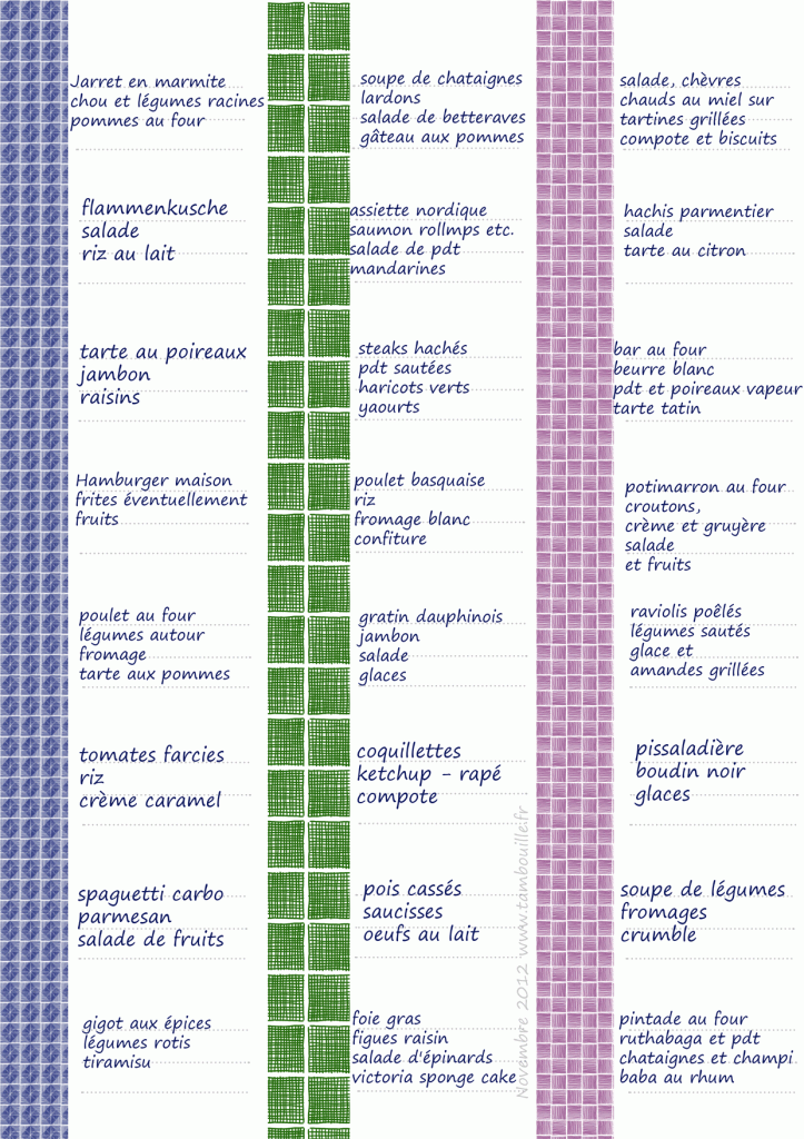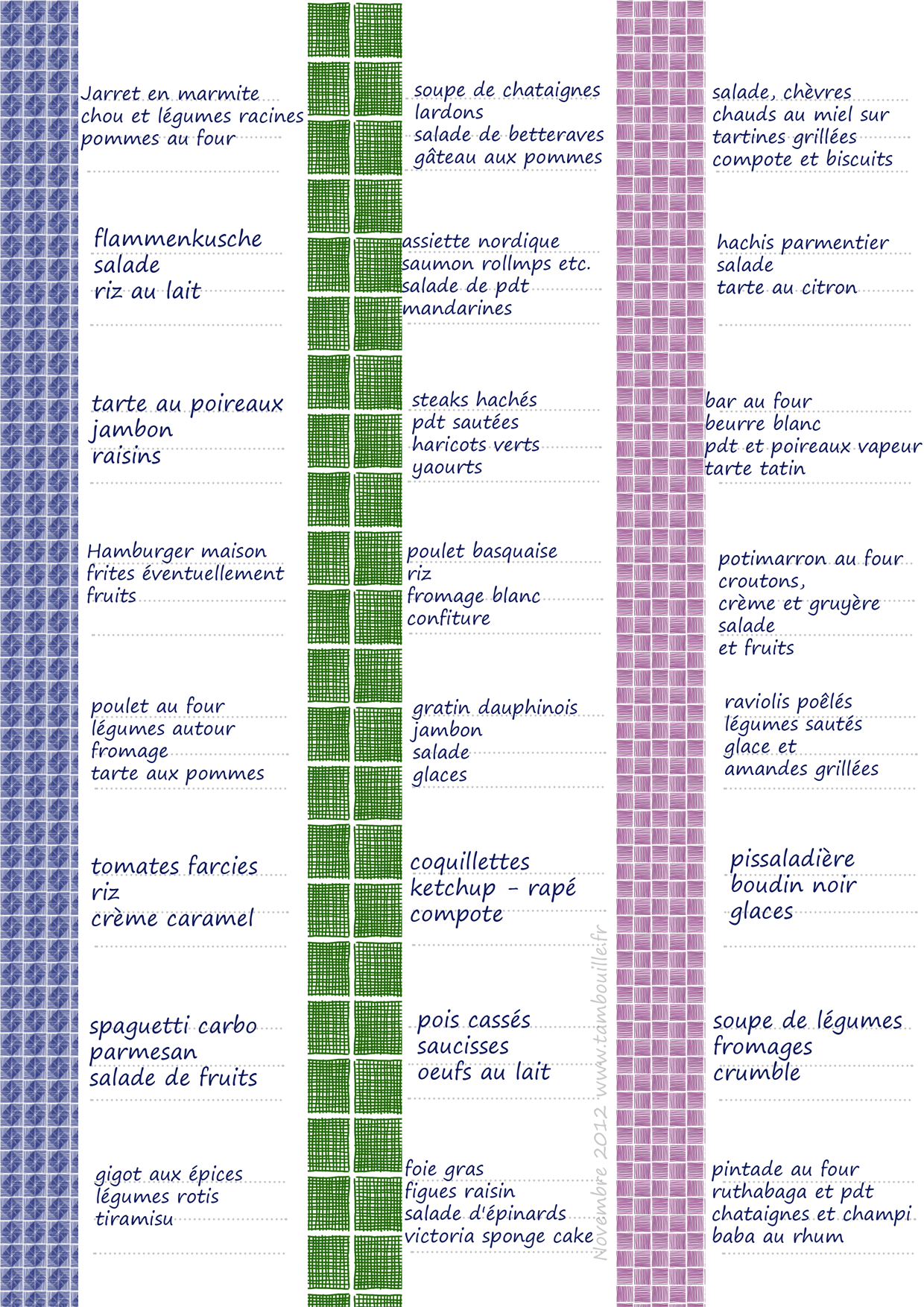 Du boulot par dessus la tête, nous ne sommes pas très présentes, voici une grille de menus pour y piocher des idées d’hiver (et se faciliter la gestion du quotidien) et à défaut de dessiner de nouvelles recettes (temporairement) suivez nous sur la page facebook, nous y faisons remonter les archives (et comme il y en a beaucoup