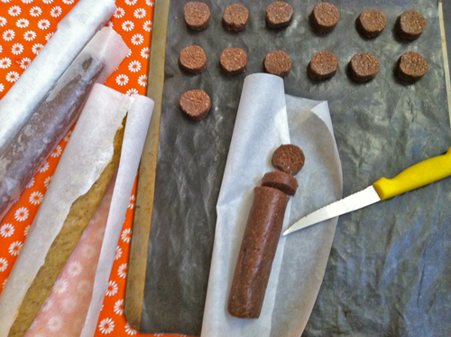 Rediviser les boules en deux et préparer 4 boudins de pâte roulés dans du papier sulfurisé. Déposer les au frigo pour 1heure.