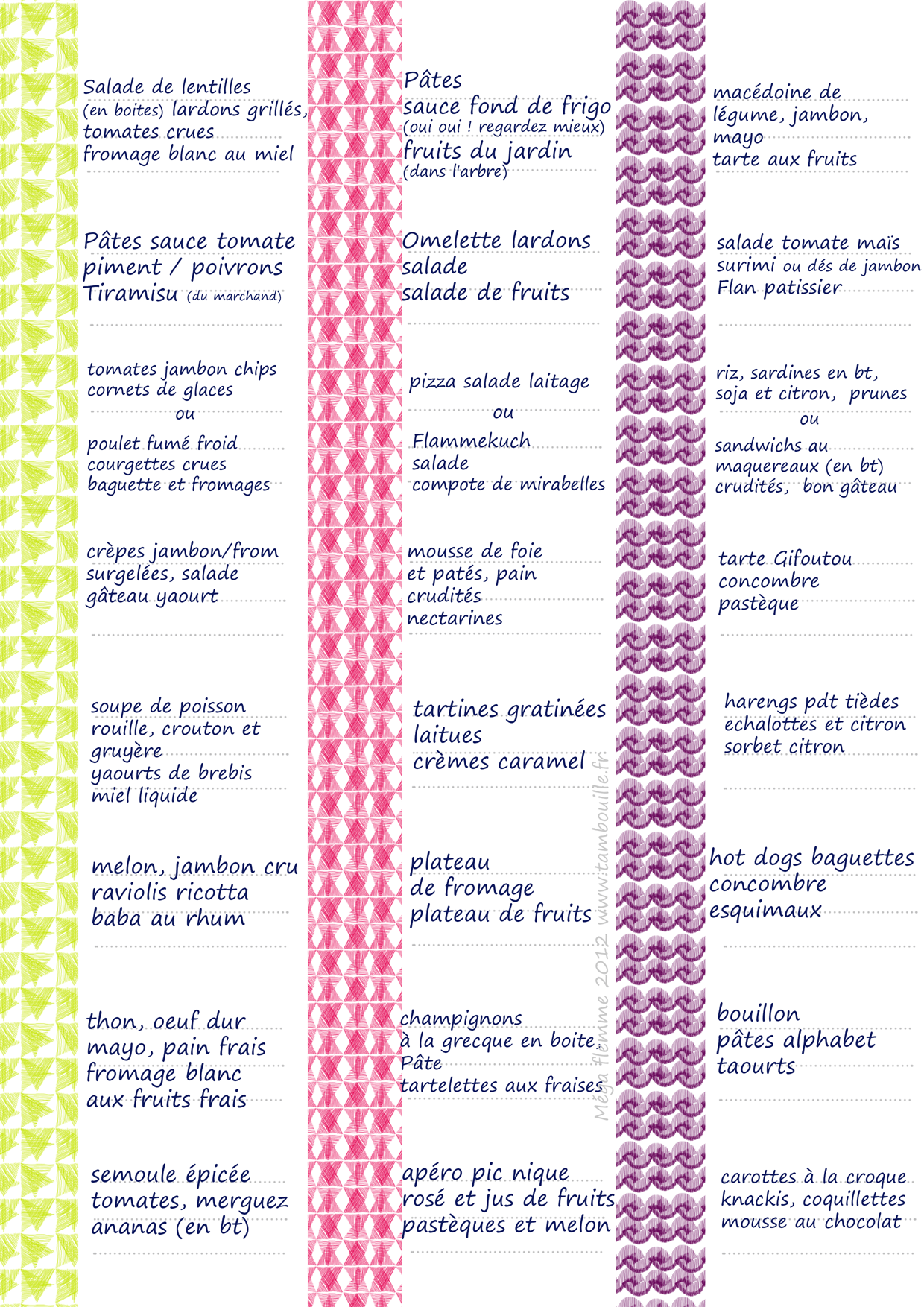 Du boulot par dessus la tête, nous ne sommes pas très présentes, voici une grille de menus pour y piocher des idées d’hiver (et se faciliter la gestion du quotidien) et à défaut de dessiner de nouvelles recettes (temporairement) suivez nous sur la page facebook, nous y faisons remonter les archives (et comme il y en a beaucoup