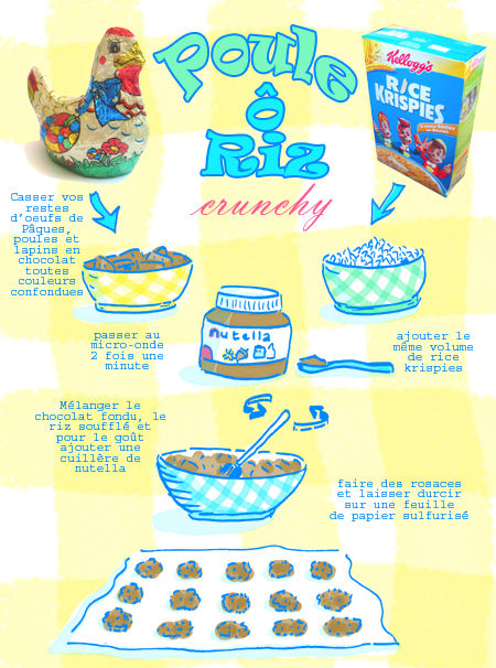 En attendant, si chez vous aussi le lapin de Pâques a déposé plein de poules et d’oeufs et que vous en avez raz-le-bol de voir trainer les derniers morceaux tout cassés et un peu fondus… faites donc une bonne poule au riz pour liquider tout ça…