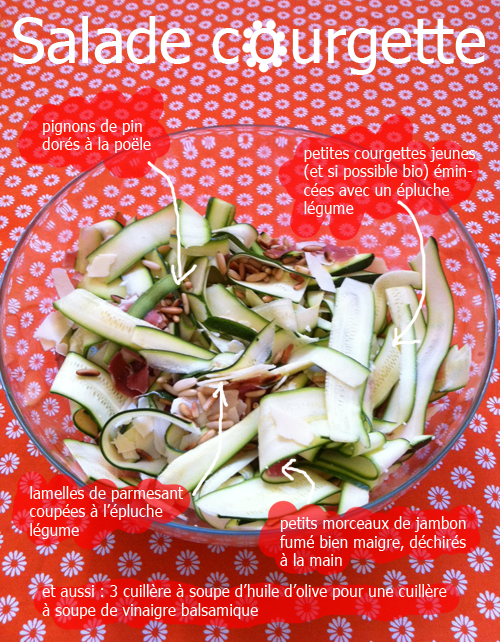 Attention, il faut vraiment des courgettes toutes jeunes, les plus petites possibles et si elles sont bio c’est encore mieux (on ne les épluche pas)… impossible donc de faire cette salade l’hiver avec des courgettes qui sont restées plusieurs jours au frigo.